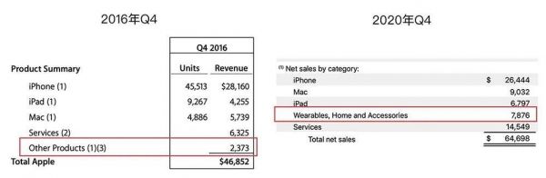 ▲苹果可穿戴设备,家居和配件业务2016年Q4和2020年Q4营收对比(苹果在2018年将“其他产品”业务更名为“可穿戴设备,家居和配件”,涵盖Apple Watch、Beats和HomePod等产品)