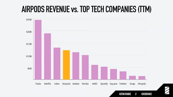 国外数据专家Kevin Rooke则给出了一组更清晰直观的数据:对比全球各公司营收和苹果AirPods销售额数据,苹果仅AirPods一类产品,销售额就已超过了Adobe和NVIDIA等公司营收,甚至是AMD营收的两倍。