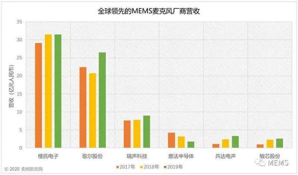 据市场调研机构麦姆斯咨询数据,在2019年全球MEMS麦克风市场中,前六大厂商分别为楼氏电子、歌尔股份、瑞声科技、意法半导体、敏芯股份、共达电声,共计市场份额超85%。
