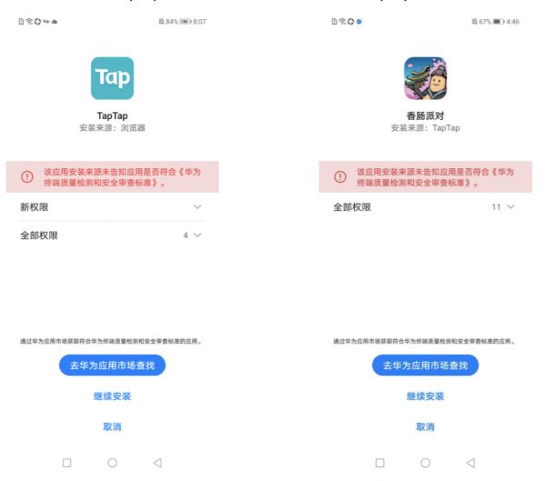 36氪获得的一份测试报告显示,以华为 P30 Pro 为例,当用户通过浏览器、TapTap 等两种方式安装游戏《香肠派对》时,系统会弹出红色警示语句,并尝试引导用户前往华为应用市场查找。但《香肠派对》未与华为官方应用商店合作,因此并未上架。用户被引导前往华为应用市场后无法找到《香肠派对》,该用户将大概率流失。