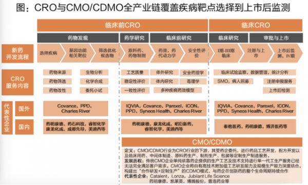 而CRO则为这些药企提供了极大的便利。他们承接新药研究各领域与阶段的外包服务,包括化学结构分析、化合物活性筛选、药理学、药代学(吸收、分布、代谢、排泄)、毒理学、药物配方、药物基因组学、药物安全性评价和I-IV期临床试验、试验设计、研究者和试验单位的选择、 监查、稽查、数据管理与分析、药品申报等。