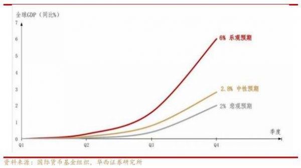 不过,全球经济回升的斜率存在着不确定性。按照国际货币基金组织提出的三种情景假设,乐观预期全球经济回升斜率将达6%,中性预期为2.8%,悲观预期为2%。
