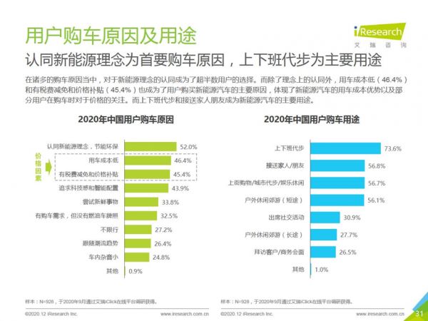 事实上,五菱宏光们的逆袭很好解释。根据艾瑞咨询的调查报告,2020年中国用户购买新能源车的用途中,“上下班通勤”占比73.6%,“接送孩子家人”占比56.8%,超过90%的用户对价格因素格外敏感。这种市场背景是平价新能源车一骑绝尘的关键原因,蔚来理想对高端的执着多少显得有些尴尬。