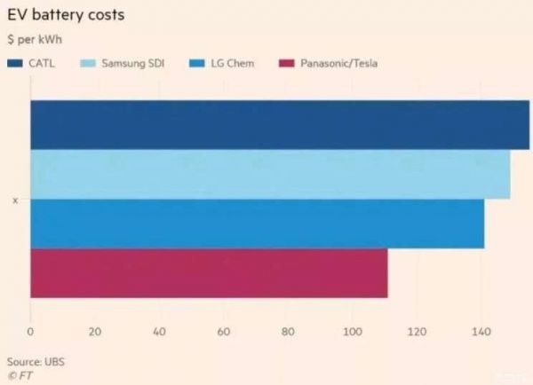 根据分析机构“瑞银”提供的报告显示,早在2018年,特斯拉与松下合作的锂电池生产技术便不断在压缩成本,甚至达到771元/kWh,优于第二名LG化学20%左右,特斯拉旗下电池成本的不断压缩也在帮助车辆获得更高的制造利润与价格空间。