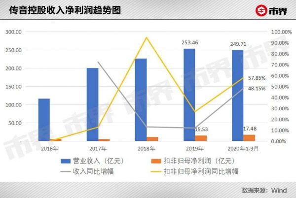 2020年1-9月,传音控股的收入和扣非归母净利润同比大增6成和5成,分别达到249.71亿元和17.48亿元,盈利总额已超过去年全年。
