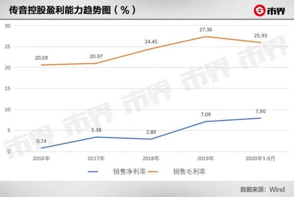 传音手机利润微薄,2016年至2020年9月末,毛利率保持在20%-30%之间,2019年每卖一部智能机和功能机,大约分别赚取120元和17元的毛利,以及31元和4元的净利。