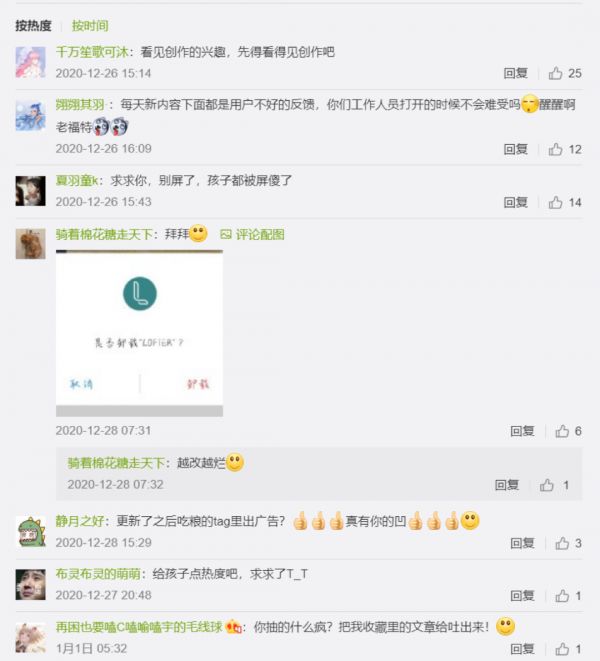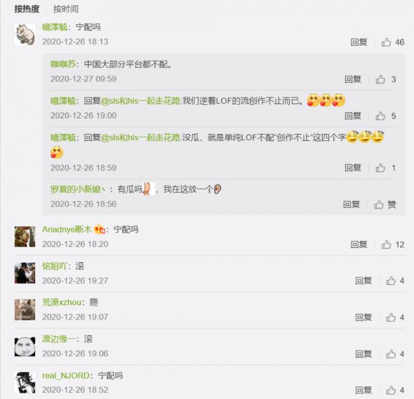 之所以对其战略有这样的推测,在于LOFTER用户与平台的关系有了明显的变化。2020年12月26日,LOFTER的官方微博发布了两条与品牌焕新发布会相关的视频,其中一条是“世界逆流而上,我们创作不止”,评论区的画风是这样的:“宁配吗”、“我们逆着LOF的流创作不止”……