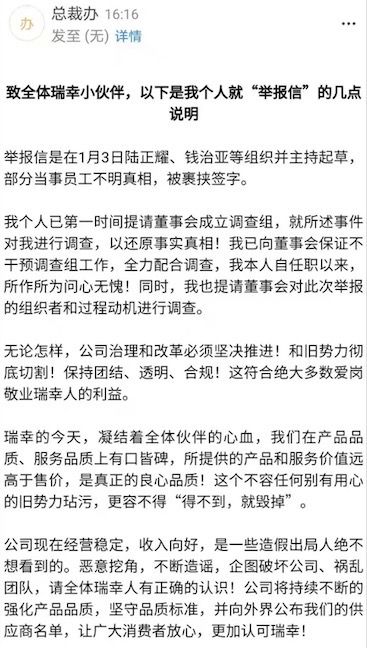瑞幸董事长回应被“逼宫”:举报信是陆正耀等起草,部分员工不明真相