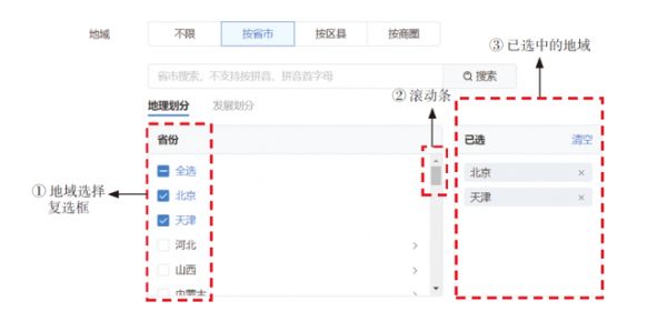 复选框。可以选择任意个选项,比如地域定向。我国有这么多的城市,像“性别”那种方式都展示出来,一个屏幕都放不下,怎么办呢?这时就出现了另一种方式,叫“复选框”。
