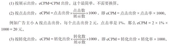 但在用户看见广告之前,大家并不知道真实的CPM是多少,所以广告后台会对CPM进行预估,我们平时看到的eCPM基本上是CPM的预估值。对应地,计算eCPM的过程中也需要使用预估点击率和预估转化率。但因为我们平时较少接触到预估的点击率和转化率,所以下文就简化写成“点击率”和“转化率”了。