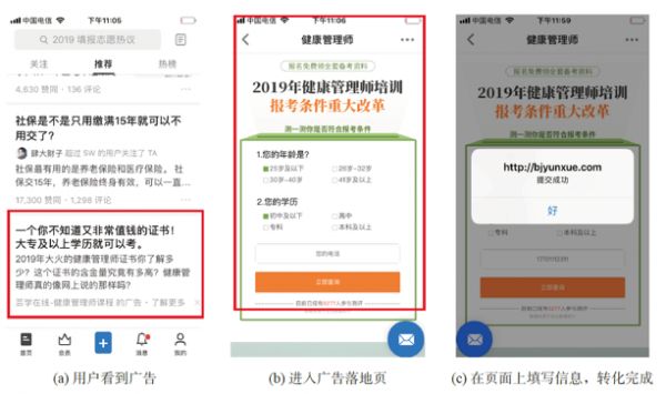 假设广告主在知乎上投放了落地页广告,我们看一下用户从看到广告到转化完成的步骤,了解这中间用户看到了什么,如图所示。