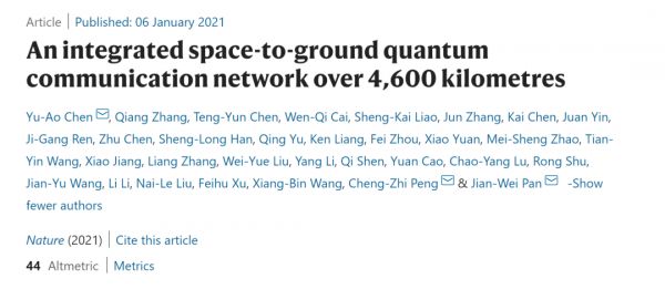 1月6日,潘建伟团队及其合作者再次推出量子通信方面的重磅成果,首次展现了一个完整的天地一体化量子通信网络,综合通信链路距离长达4600公里。该论文已被Nature收录。