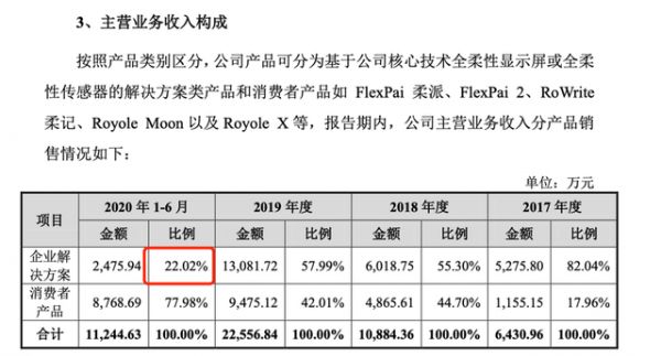 其中释放的一个信号尤其值得关注,公司主营业务里to B业务占比从2017年的82.04%,一路下至2020年上半年的22.02%,to B的业务收入仅为2476万元。这也就意味着,柔宇深耕多年的柔面屏技术,依旧没有在B端市场被接纳。