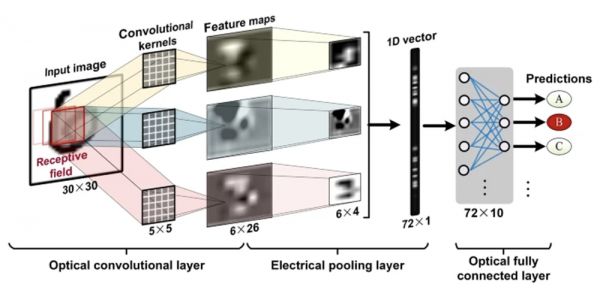 该论文展示了一种通用光学向量卷积加速器,其计算速度可超过10 TOPS(每秒10万亿次运算),能生成足以进行人脸识别的25万个像素的图像卷积。研究人员使用相同硬件运行一个有10个输出神经元的光学卷积神经网络,识别手写数字图像的准确率达88%。