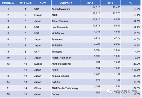 ▼下图所示为2019年全球排名前15的半导体设备厂商(单位:百万美元)。