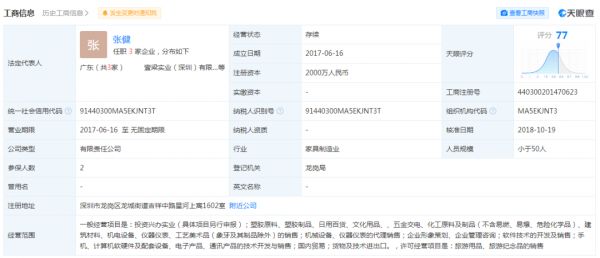 天眼查显示,壹梁实业成立于2017年6月16日,所属行业为家具制造业,法定代表人为张健,实际控制人为童章。