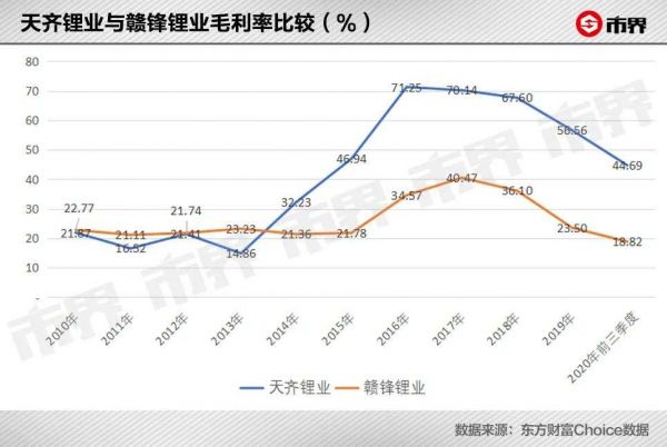 既掌握上游资源,又有强大生产线做支撑,天齐锂业由一个锂产品加工商,摇身一变成为了“矿主”。公司毛利率迅速提升,并反超竞争对手赣锋锂业。