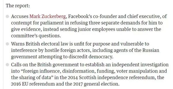这份报告甚至还建议英国政府成立一个独立的调查组,去进一步调查2014年苏格兰脱英公投、2016年英国脱欧公投以及2017年英国大选期间,外国敌对势力是如何通过假消息去影响英国选民的,以及背后的资金和用户信息盗用问题等等。