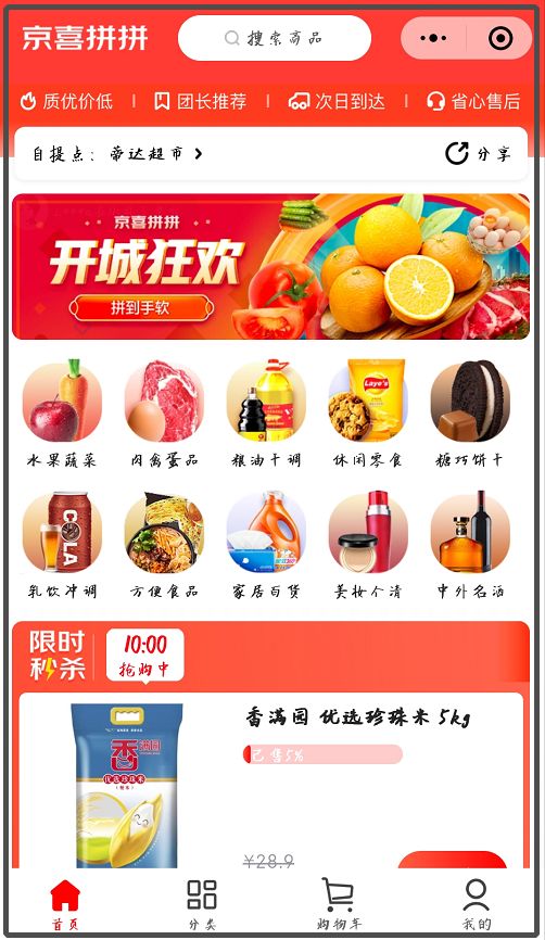 2021年元旦,京东上线社区团购小程序“京喜拼拼”,剑指多多买菜,通过整合京东生鲜、线下商超相关业务,现已进入济南、成都、郑州等13个城市,利用社群推广和京东供应商及物流资源,加速拉新,做大订单量。
