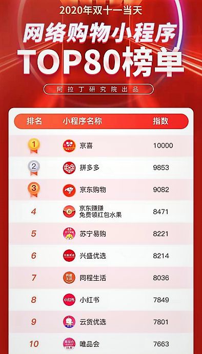 去年双11期间,微信发现页面专门为京喜增设流量入口。据阿拉丁研究院发布的双11电商小程序榜单,京喜小程序日活量、分享次数、停留时长、访问深度等维度综合指数,超过拼多多,尤其是京喜新用户环比增长近7倍。