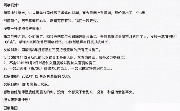 就在2020年12月31日,百度内网发布公告,为工作两年以上的员工发放“U奖金”。