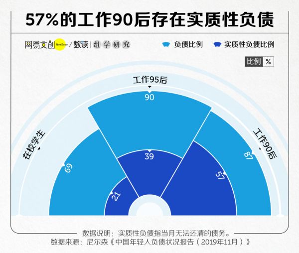 其中,工作 90 后实质性负债比例最高,为 57%,且远高于在校学生的 21% 和工作 95 后的 39%。