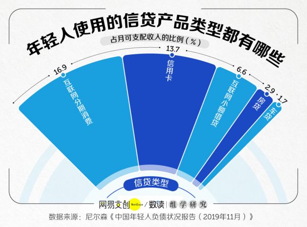 于是,借来的钱大都花在了“买买买”上。互联网分期消费和信用卡是年轻人最常用的两种信贷产品,他们月收入的 30.6% 都要用来偿还这些借款。