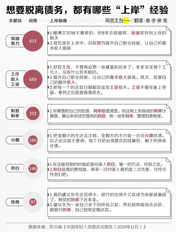 他们总结出的上岸方法有许多种,包括找一份稳定工作、向父母爱人坦白、提高收入、理清欠款利率等等。