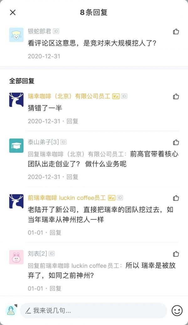 2021年1月初,社交软件脉脉上,有瑞幸员工曝出:瑞幸咖啡技术团队被陆正耀大规模挖走,“如同当年瑞幸从神州挖人一样。” 有员工跟新公司签署协议后“承诺的薪水与奖金很高”。