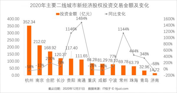 IT 桔子发现:在一线城市中,2020 年深圳和上海新经济投资金额继续保持增长,而北京相比去年却处于负增长;在二线城市中,除杭州、南京、成都、重庆的新经济股权投资额有所下降外,长沙、合肥、南通、宁波、珠海、青岛均处于不同程度的增长之势。(该数据详情会在 IT 桔子《2020-2021 年中国新经济创业投资分析报告》中具体呈现。)