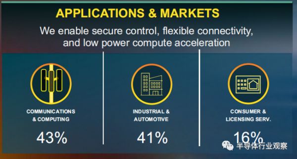 通讯与计算(Communications and Computing)、工业与汽车(Industrial and Automotive)、消费(Consumer)正是Lattice重点布局的三个领域。根据其官网消息显示,这三个领域营收占比分别为43%、41%和16%。另外一方面,Lattice营收中一大主要来源是在中国,而其实现大幅度的增长也源于他们在中国的业绩在每个季度都屡创新高。