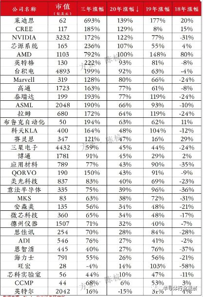 位居全球半导体增幅排行榜第三位的英伟达,是半导体行业的明星。凭借GPU起家的英伟达,利用GPU在AI领域取得了关键优势,使之成为了能够挑战半导体一直以来的行业龙头(英特尔)的地位——在2020年当中,英伟达的市值曾一度超越英特尔。