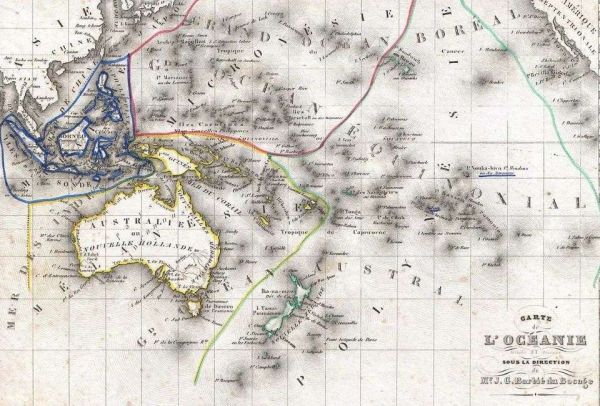 在这张1852年的太平洋地图里,欧洲人将太平洋划分成了3个地理区域