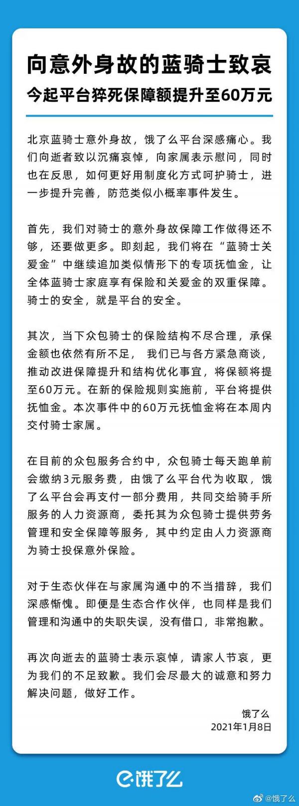 在一片质疑声中,1月8日,饿了么做出回应,向韩某致哀,并将保障额提升至60万元,本次事件中的60万元抚恤金,将在本周交给家属。