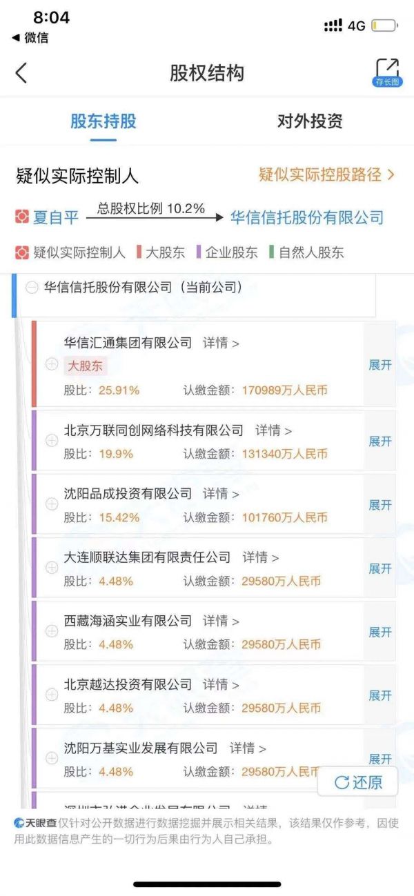 企查查数据显示,华信汇通集团有限公司成立于2004年11月,注册资本33亿元,有16家股东,法定代表人及董事长为董永成。2019年末该公司未经审计的资产总额为88亿元,实现利润总额 3.3亿元。2020年12月9日,其持有的华信信托股权被大连市中级人民法院冻结。