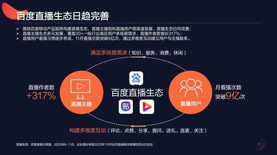 1月8日,百度营销发布《直播百态,激活营销新形态——百度直播生态洞察报告》。在报告中,百度提及了它直播业务半年来的成绩——月看播量突破9亿、创作者数量大幅增长317%,人均评论次数增幅超过95%,平均每场直播打赏金额增长219%。