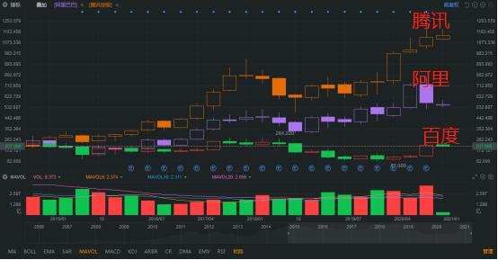 另外,百度回港二次上市也并不是没有道理,从百度、阿里与腾讯三家公司上市以来股价变动就能看出。百度股价走势图呈现滑坡态势,而阿里与腾讯是明显的爬坡态势。可见,百度近年来在美股市场的日子不太好过,一直被华尔街市场低估。