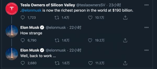 当天,彭博社亿万富翁指数最新排名显示,随着特斯拉股价开盘大涨,身家达到1850亿美元,超过杰夫·贝佐斯(1840亿美元),成为新世界首富之后,马斯克在其社交平台上用“凡尔赛体”回复称:“How strange。”“Well, back to work …”
