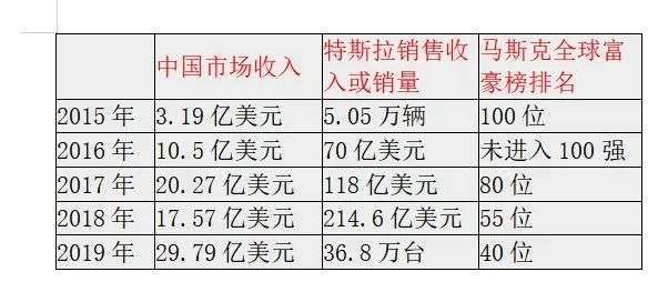 2015-2019年特斯拉中国市场收入与马斯克富豪榜排名变化
