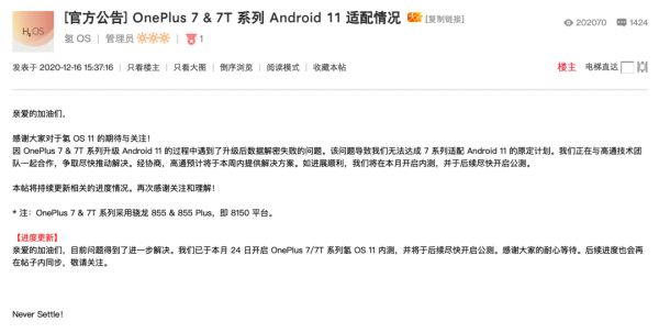 关于 一加 7 / 7T 系列 Android 11 适配情况的官方公告。图片来自:一加社区