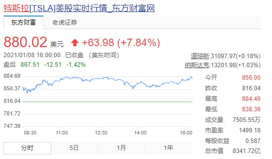 截至当地时间1月8日美股收盘,特斯拉股价涨至880.02美元,总市值8341.72亿美元,2021年才刚刚过去5个交易日,特斯拉就又上涨了近25%。