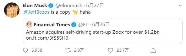 2020年6月,亚马逊收购了一家自动驾驶公司Zoox,最近这家公司已经推出一款机器人出租车的模型。马斯克说贝索斯是一个 “copy cat”不仅把cat换成了猫咪的emoji表情,还嘲笑的“haha”。