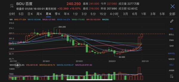 2020年末,伴随着下场造车的传闻,百度市值一路回升。中银国际对百度重申“买入”评级,并将目标价由181美元上调至234美元。截至上周五美股收盘,百度每股报价240.25美元,涨幅15.57%,总市值达到819亿美元。2020年内股价涨幅达到71%。