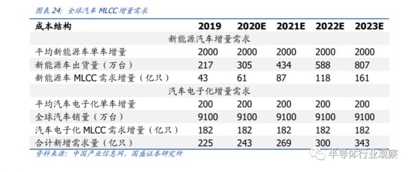 并且新能源汽车出货量逐年提高,有望进一步扩大车规 MLCC 市场规模。根据太阳诱电预测数据,2023年全球汽车MLCC需求规模将为 2019 年的 1.9 倍。根据中国产业信息网预测,2020年到2023年,汽车MLCC合计新增需求量将保持增长趋势,2023年有望达到343亿只。