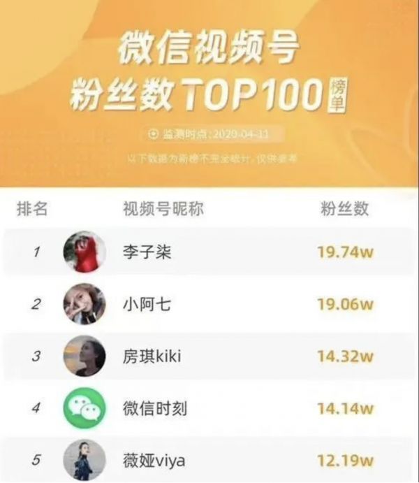 视频号内测3个月后,4月,首次有媒体制作了微信视频号粉丝数TOP100榜单,旨在以总粉丝数来衡量视频号创作者的影响力。