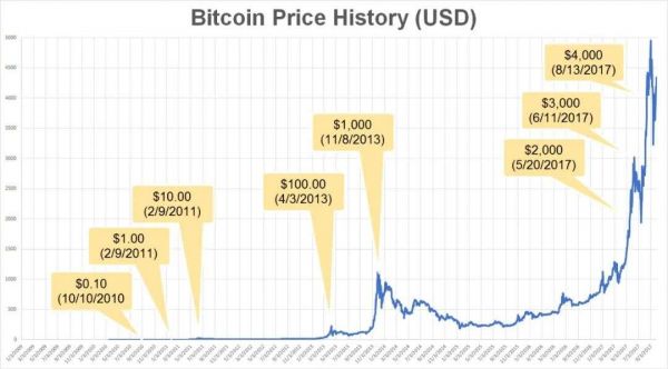 比特币诞生之时,价格还不到1美分,1美元可以兑换1300个比特币,此后一年内也不过涨了几美分。
