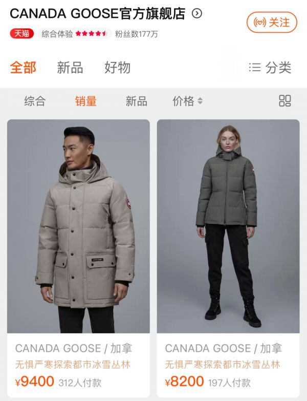 加拿大鹅于2018年入驻天猫,目前粉丝数为177万