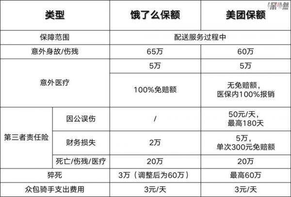 在保险上,美团外卖与饿了么类似,专送骑手的保险由站点按月扣除,具体金额也由站点决定;众包骑手的保险则是按天扣除,每天3元,保障时间当日24时。据深燃统计,两个平台这份综合意外险+第三方责任险的保额差别不大,差别主要在猝死的保额上,饿了么修改前为3万,修改后和美团一致为60万。饿了么事件的最新进展是,饿了么向韩某致哀并向家属提供60万元的抚恤金,此后平台也将猝死保障额提升至60万元。