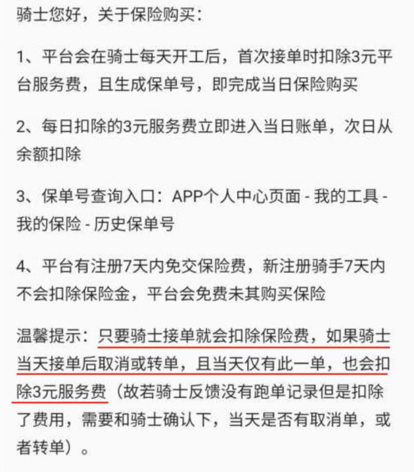 从网友提供的关于这笔保险说明的截图来看,图中这段表述很容易理解为,骑手被扣除的3元都被用于购买人身意外险了,但事实上,平台收取了其中的65%作为服务费,只有1.06元花在了保险上。换言之,一年365天的保费是386.9元,但骑手个人需要被扣1095元。