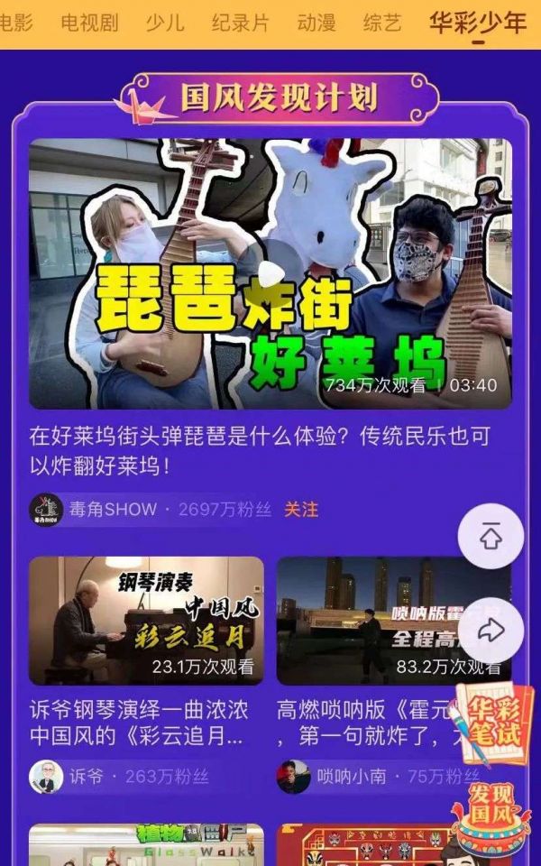 其中,“发现国风”是西瓜视频依托节目定制的主题视频计划,以瓜分福利引导平台创作者挖掘、创作综艺衍生内容,以此实现IP价值延伸。《华彩少年》一经上线,便有近5000名用户涌进该专区,投递民乐民舞、美食美味、传统文化等国风主题原创视频。